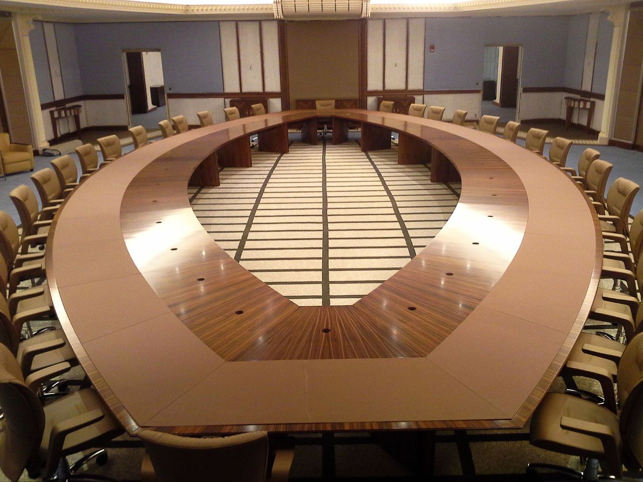 Notre contribution s’est concentrée sur la réalisation des tables de réunion, développées avec une caractéristique distinctive : des conduits d’air dissimulés sous le plateau en cuir parcourent l’ensemble de la surface, permettant le chauffage ou le refroidissement afin d’améliorer le confort thermique de chaque utilisateur. Ancrée dans le savoir-faire et l’attention portée aux détails, la solution s’intègre avec fluidité — discrètement technique, résolument raffinée.